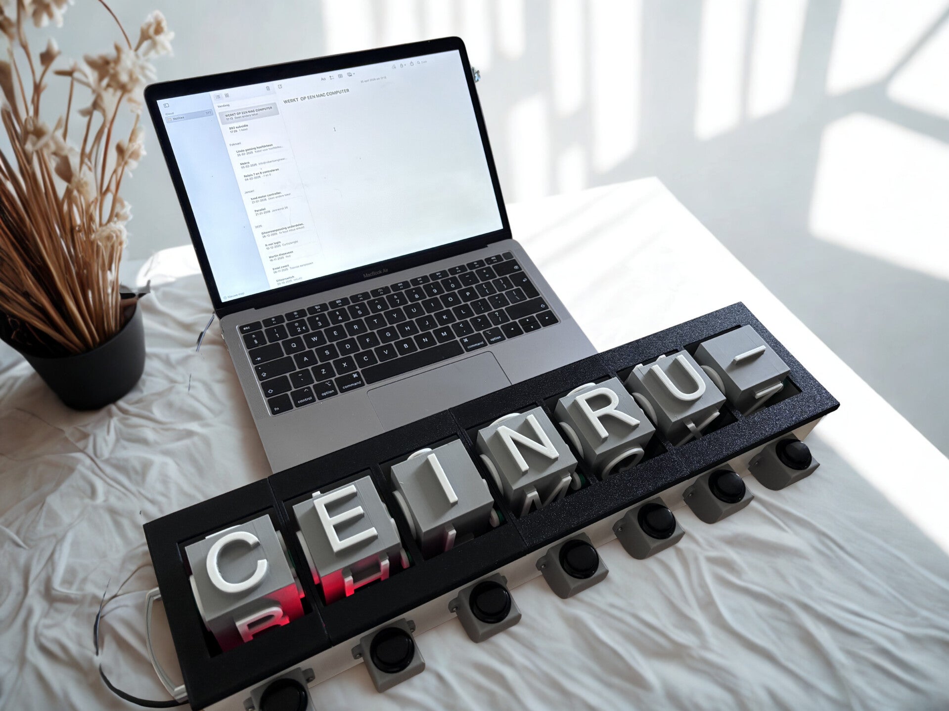 Door de letters te voelen en te draaien, kan je de juiste letter selecteren door op de zwarte bijbehorende knop te drukken.